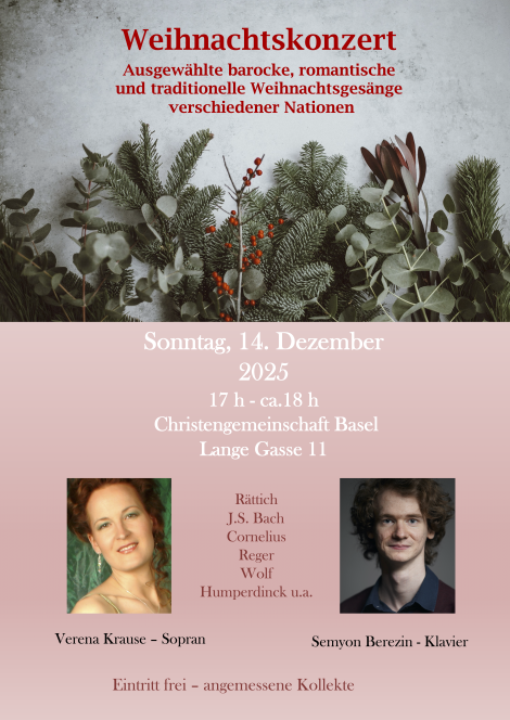 WeihnachtskonzertDer Stern von Bethlehem, Josef Gabriel Rheinberger Verena Krause, Sopran Manuel Polliger, Bass Berner Mottetenchor Singkreis der Freideenskirche Bern Kammerorchester der Basler Chemie Andrey Smirnov, Konzertmeister Katja Kofanova, Leitung |
