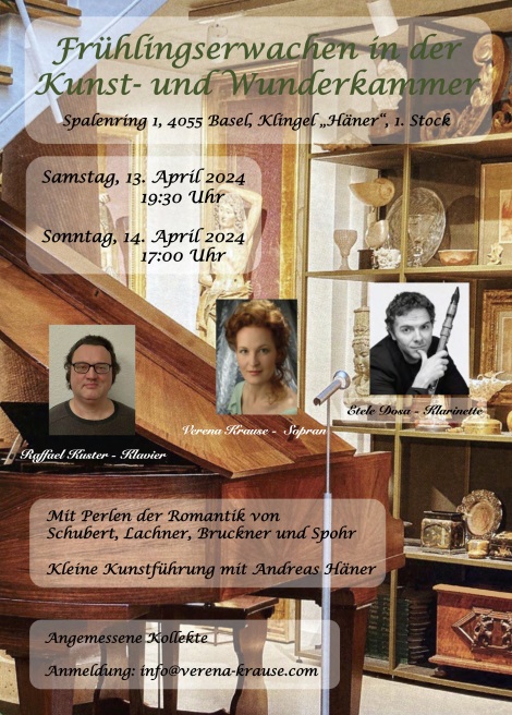 Kammermusik-Abend"Zauberstimme, Tastenzauber und wie sich die Klarinette in ein Sax verwandelte..." Verena Krause, Sopran Kirill Zwegintsow, Klavier Jonas Tschanz, Saxophon Schubert: Hirt auf dem Felsen, Lachner, Schumann u.a. Reservationen bald unter http://www.heutschipianos.ch/dienstleistungen/reservationen Pianos Heutschi, Morillonstr.14, Bern |